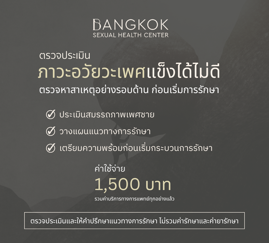 แพ็คเกจนี้เป็นการตรวจประเมินและการให้คำปรึกษาโดยแพทย์เวชศาสตร์ทางเพศ ยังไม่ครอบคลุมการบำบัดรักษา การตรวจทางห้องปฏิบัติการ และการรับยา จะแจ้งค่าใช้จ่ายให้ทราบก่อนการรักษา