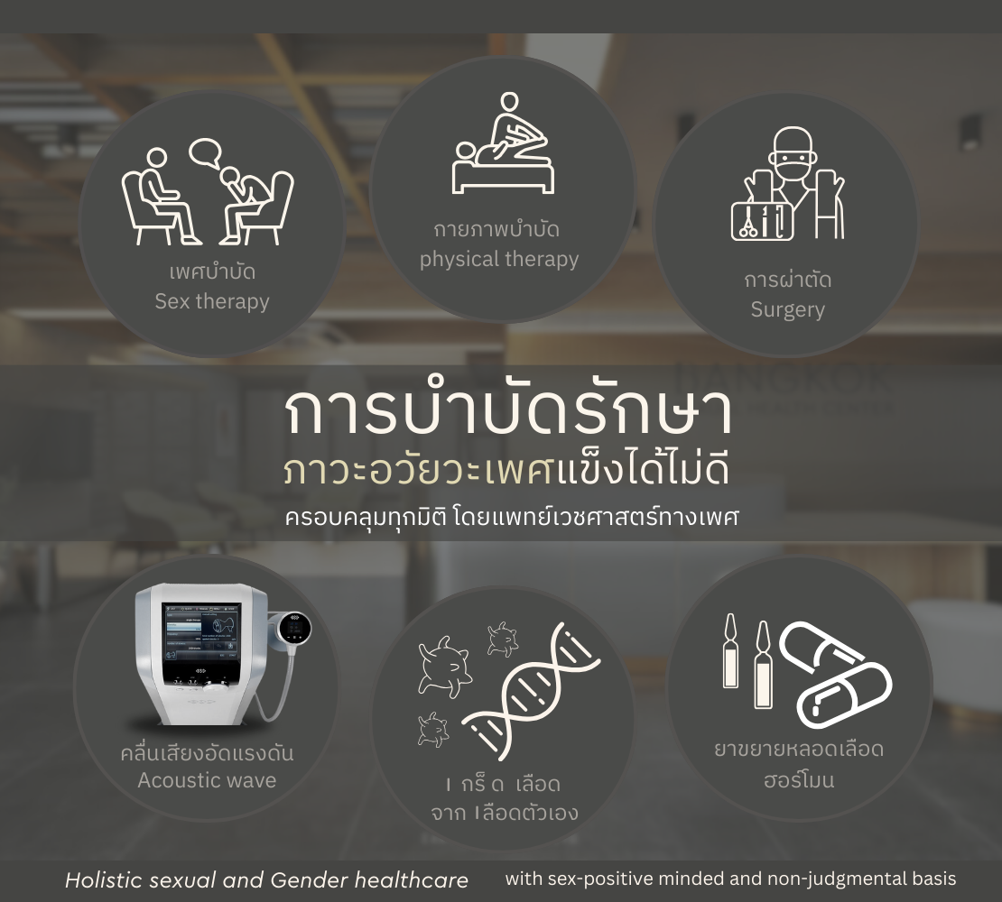ซักประวัติ ตรวจประเมินร่างกายและทำแบบประเมินเพื่อค้นหาสาเหตุทั้ง 4 มิติ ได้แก่ โรคทางกาย โรคทางใจ สังคมความเชื่อและความสัมพันธ์ และการรักษาที่ถูกต้องแบบองค์รวม โดยแพทย์เฉพาะทางเวชศาสตร์ทางเพศ